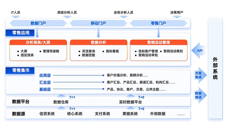 長亮科技緊抓國內銀行零售數字化轉型的需求,將數字化技術與零售業務流程深度耦合,為銀行提供涵蓋零售數據采集、數據整合、數據加工、數據服務、數據應用支撐為一體的數字化零售經營分析解決方案,該方案以打造銀行零售類應用及服務的基礎數據平臺為目標,旨在強化零售業務數據治理,有效沉淀零售數據資產,為零售業務的營銷、風控、經營決策等全鏈條環節提供數據服務,以提升零售獲客洞察與價值挖潛能力,助力零售業務數字化轉型。