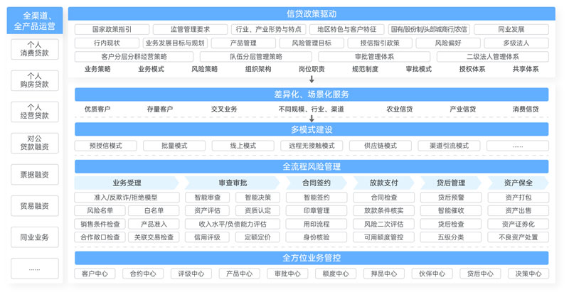 在業(yè)務(wù)應(yīng)用層面,以“雙客”(客戶(hù)經(jīng)理、客戶(hù))為中心、線下產(chǎn)品線上化、場(chǎng)景數(shù)字化,對(duì)不同行業(yè)、類(lèi)別、風(fēng)險(xiǎn)等客戶(hù)提供差異化服務(wù),實(shí)現(xiàn)“千人千面”、“千人一面”,為客戶(hù)提供量身定制的信貸產(chǎn)品,滿足不同客戶(hù)群體的需求;通過(guò)無(wú)紙化、業(yè)務(wù)移動(dòng)化、流程可視化,優(yōu)化信貸業(yè)務(wù)流程,簡(jiǎn)化辦理流程,提升精細(xì)化管理水平;以業(yè)務(wù)邏輯劃分各個(gè)獨(dú)立又互相協(xié)作的能力中心,包括客戶(hù)中心、產(chǎn)品中心、定價(jià)中心、額度中心、審批中心、評(píng)級(jí)中心、押品中心、貸后中心、核算中心等,支持金融機(jī)構(gòu)以此為依托進(jìn)行個(gè)人貸款、對(duì)公信貸、同業(yè)信貸、集團(tuán)信貸、小微信貸、普惠業(yè)務(wù)、網(wǎng)貸業(yè)務(wù)(包括助貸、聯(lián)合貸、信用付)等各類(lèi)貸款業(yè)務(wù)的產(chǎn)品創(chuàng)新和運(yùn)營(yíng)創(chuàng)新。