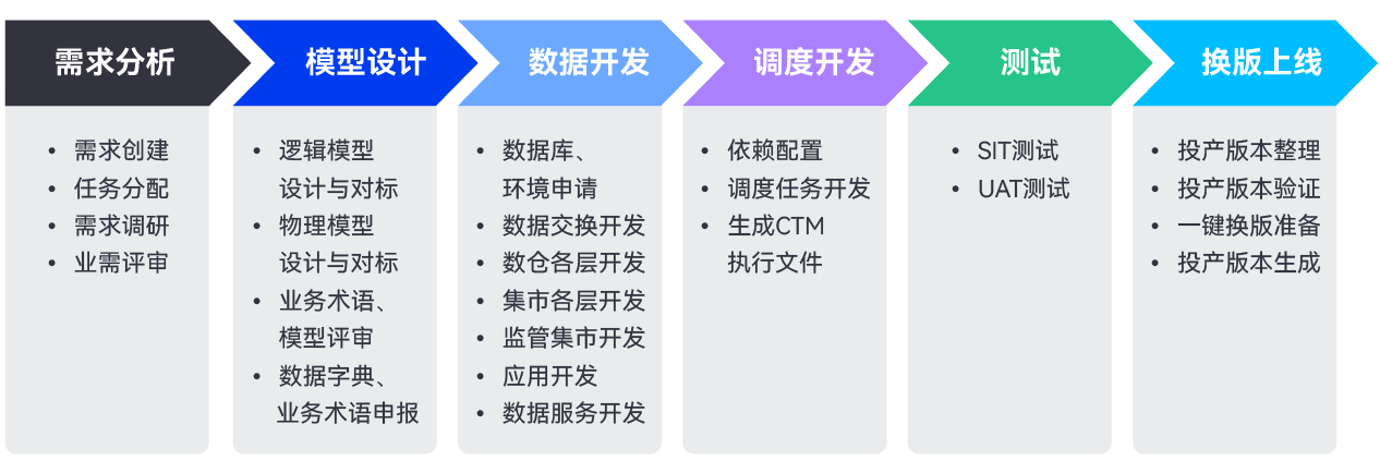 該平臺(tái)打通了數(shù)據(jù)研發(fā)運(yùn)維從需求到上線的多個(gè)關(guān)鍵環(huán)節(jié),通過敏捷需求管理、模型設(shè)計(jì)即治理、全開發(fā)場景支持、自動(dòng)化單元測試、一鍵提測與發(fā)布、全面需求監(jiān)控的全鏈路智能化管控,確保數(shù)據(jù)開發(fā)全過程的順暢與協(xié)同。