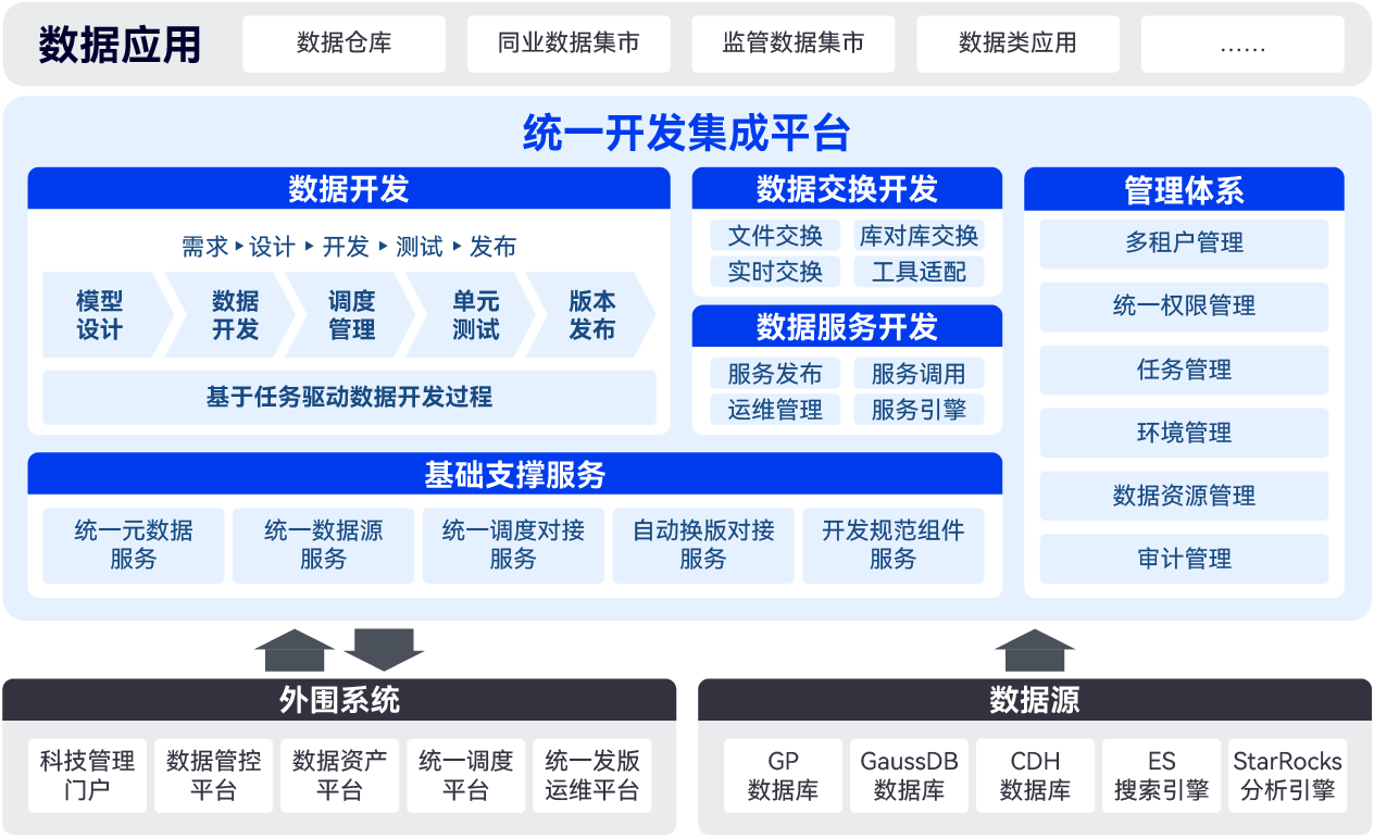 結(jié)合南京銀行的數(shù)字能力現(xiàn)狀,長亮科技項(xiàng)目團(tuán)隊(duì)遵循“利舊原則”,對(duì)其現(xiàn)有數(shù)據(jù)產(chǎn)品進(jìn)行全面整合與升級(jí),集成了離線開發(fā)平臺(tái)、數(shù)據(jù)交換系統(tǒng)、統(tǒng)一調(diào)度平臺(tái)及大數(shù)據(jù)接口發(fā)布系統(tǒng),并打通了數(shù)據(jù)資產(chǎn)平臺(tái)、數(shù)據(jù)管控平臺(tái)、各源系統(tǒng)、科管及統(tǒng)一運(yùn)維發(fā)版平臺(tái)。