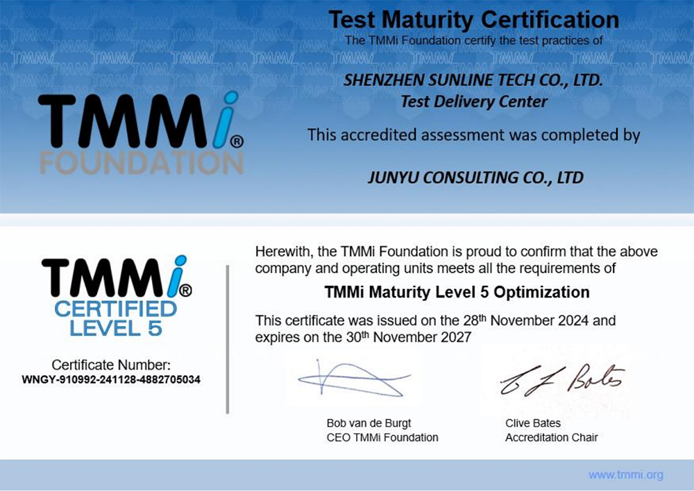 TMMi(Test Maturity Model Integration,測試成熟度模型集成)作為國際公認的測試管理體系構建和測試過程改進權威評估標準,旨在支持世界各地的組織改進其軟件和系統測試成熟度,其認證體系涵蓋了從需求分析、設計開發、項目管理直至產品交付的全生命周期管理,是企業軟件產品質量管理水平最有力的資質證明。TMMi認證共分為五個成熟度級別,其中5級是對測試組織成熟度的最高認證。
