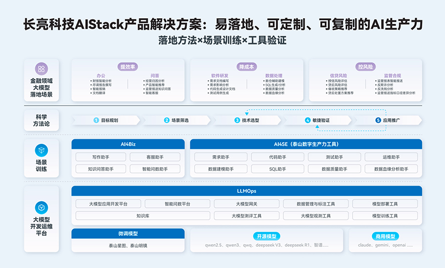 面對金融行業(yè)在大模型應(yīng)用中普遍存在的四大痛點——通用模型理解力不足、知識碎片化、復(fù)雜關(guān)系難梳理、部署成本高昂,長亮科技打造了“泰山數(shù)字生產(chǎn)力工具成熟產(chǎn)品體系”,致力于實現(xiàn)高確定性的金融AI落地。