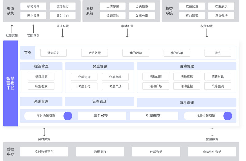 以“營銷服務為核心、信息分析為指導、業績監督為驅動”,整合內外部數據,采用數據分析挖掘模型,內置決策引擎、實時處理技術、可視化分析等手段,有效構建“全面客戶認識、有效客戶細分、精準客戶營銷、個性化客戶服務、精細化營銷分析”的營銷服務體系,實現以經營效果為導向的營銷策略閉環。