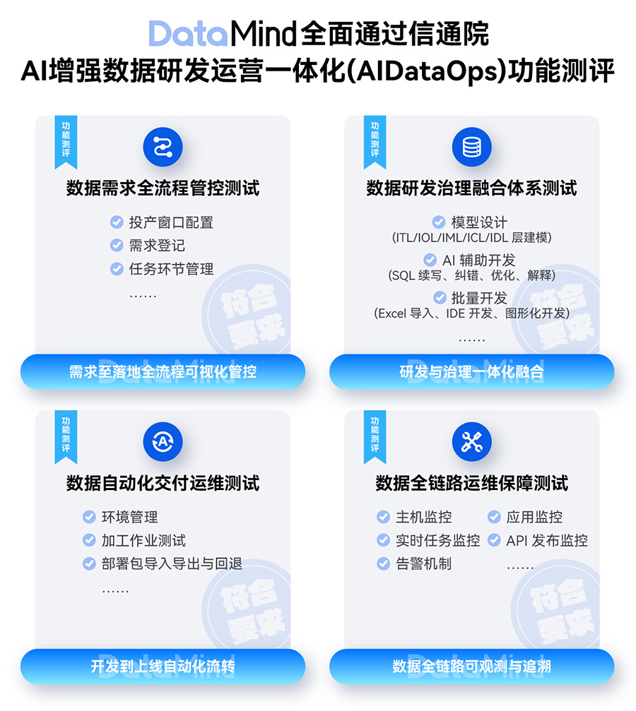 此次測評涵蓋數據需求全流程管控、數據研發治理融合體系、數據自動化交付運維、數據全鏈路運維保障四大能力模塊,共計57項測試。DataMind以100%通過率完成全部嚴格檢驗,充分展現該平臺在穩定性與功能性上的卓越表現,為金融行業數據價值釋放提供了參考范式。