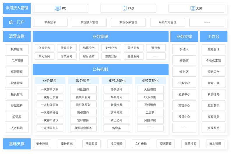 定位于面向場景設(shè)計(jì)的、能夠支撐銀行網(wǎng)點(diǎn)一體化信息建設(shè)的新型應(yīng)用平臺,設(shè)計(jì)上以客戶為中心,以智能化、高效運(yùn)營、業(yè)務(wù)統(tǒng)一化為目標(biāo),同時(shí)整合網(wǎng)點(diǎn)內(nèi)外所有人、設(shè)備和系統(tǒng),將業(yè)務(wù)流程打通,面向客戶進(jìn)行數(shù)據(jù)共享,做到一次識別、一次驗(yàn)證、一次確認(rèn)、一次打印,助力銀行提高客戶體驗(yàn)度、提升柜員作業(yè)效率、降低網(wǎng)點(diǎn)操作風(fēng)險(xiǎn),全面提升網(wǎng)點(diǎn)的營銷能力和服務(wù)能力。