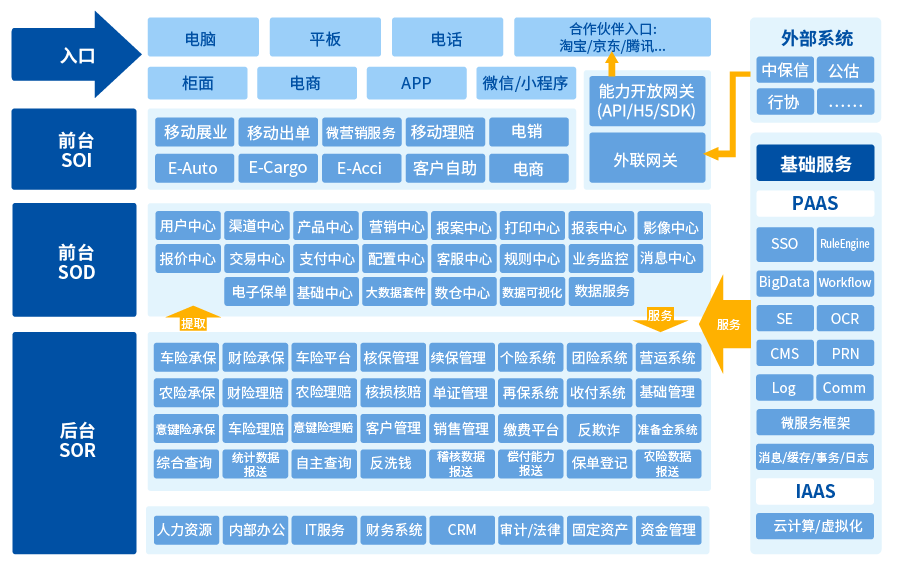根據Gatner在2016年提出的一份《Pace-Layered Application Strategy》報告,按照“步速”將企業(yè)的應用系統(tǒng)劃分為三個層次,SOR(Systems of record ),SOD(Systems of differentiation)和SOI(Systems of innovation),保險企業(yè)的整體架構可按前臺、中臺和后臺相對應進行劃分。