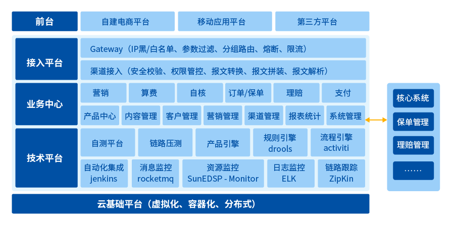 長亮保泰團隊根據多年互聯網保險系統(tǒng)建設經驗,重點關注保險業(yè)務創(chuàng)新支持,打造一個產品工廠+多渠道接入+互聯網平臺的中臺架構,逐步形成企業(yè)級的業(yè)務能力和技術能力復用平臺,如下圖所示:
