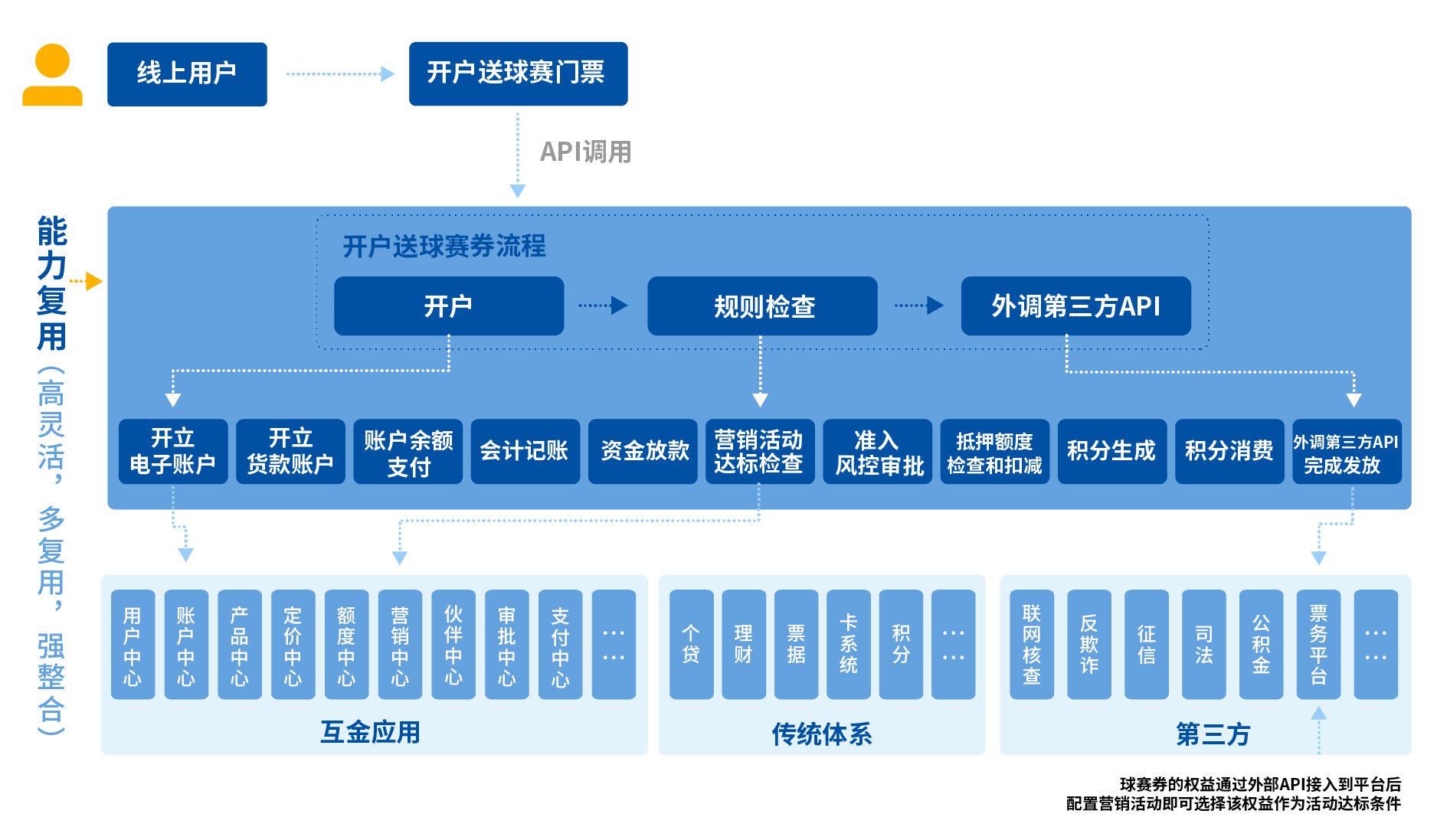 以開戶送球賽門票為例:通過流程編排服務(wù),組合賬戶中心的開立電子賬號的API接口、營銷中心的營銷活動達標檢查接口、票務(wù)平臺的第三方API接口這三個服務(wù),共同實現(xiàn)開戶送球賽門票的場景。
