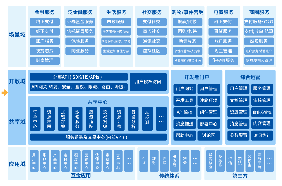 長亮科技開放平臺通過共享域來整合應(yīng)用的金融能力,通過開放域來將金融能力輸出給場景方。