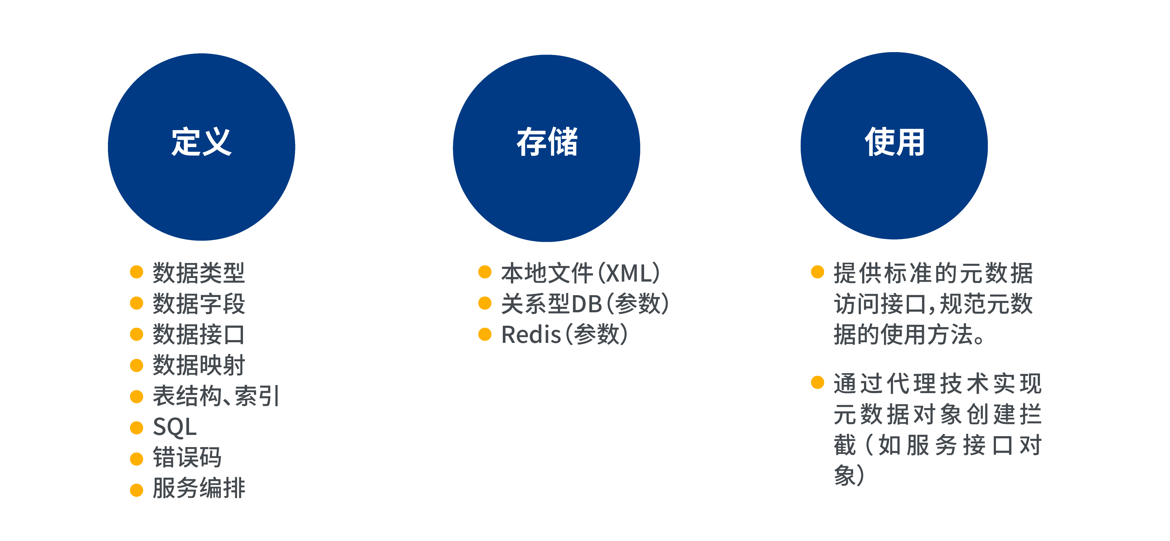 元數據,向應用組件提供類型、字段、接口、服務編排、表結構、SQL、錯誤碼等數據的定義、存儲和使用。元數據的最大價值是支撐標準的落地,讓應用組件的開發標準化。