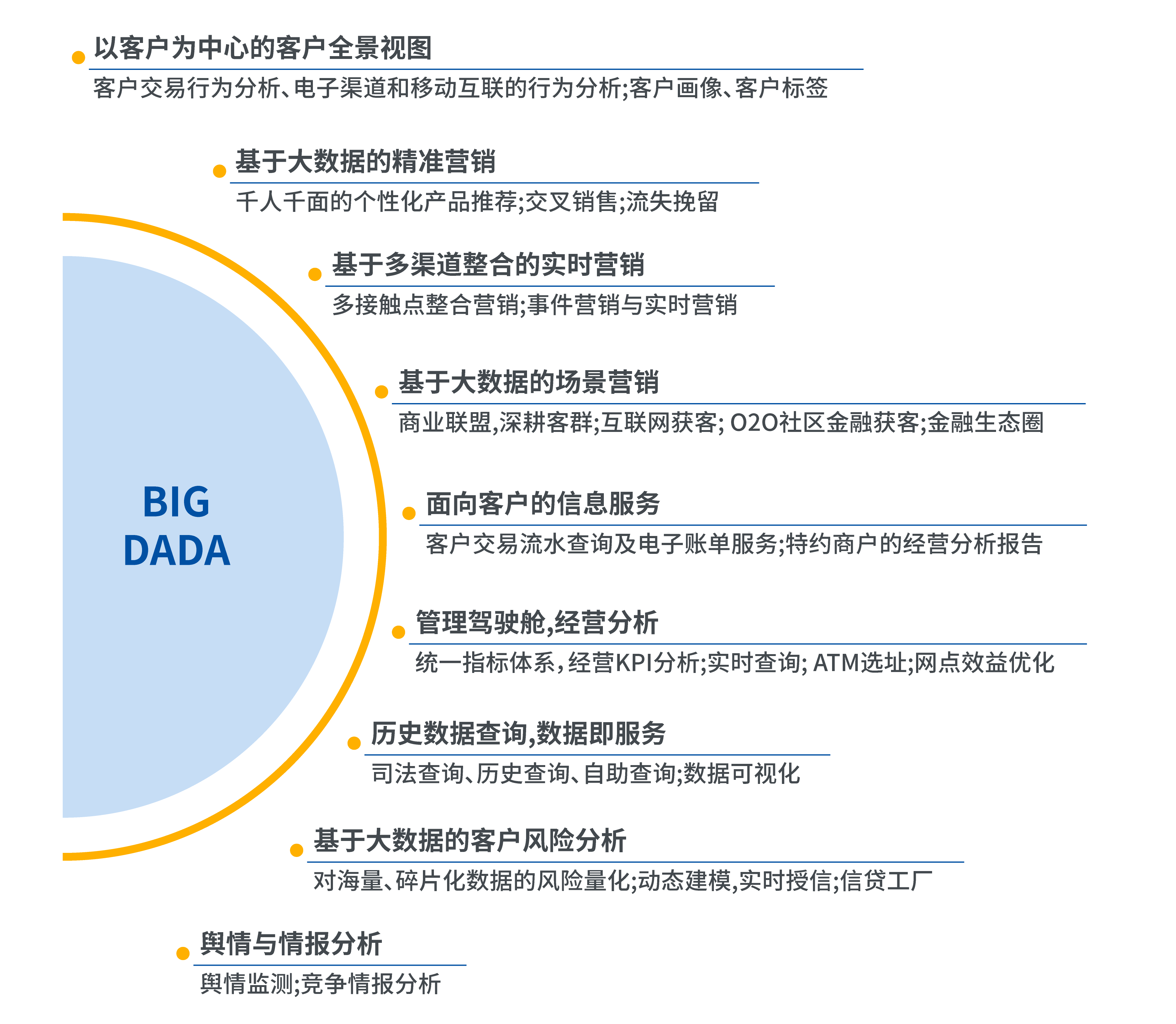 客戶畫像丨深度分析挖掘,對客戶交易行為、金融產品偏好、渠道偏好實現全面了解,實現客戶畫像和分群、客戶實時評價。在與第三方進行聯盟之后,還可以實現完整的客戶全景視圖。