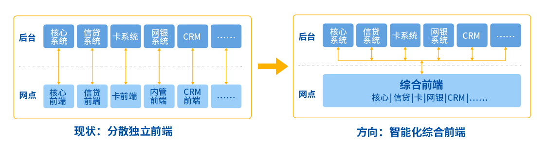 首先,要在橫向上進行業務功能聚合,將原來分散在各個系統的前端功能統一整合到統一的前端平臺中,并實現數據共享和統一高效的操作體驗;在縱向上整合多系統、多設備作業流程,實現客戶多渠道統一服務體驗和網點產品協同營銷。