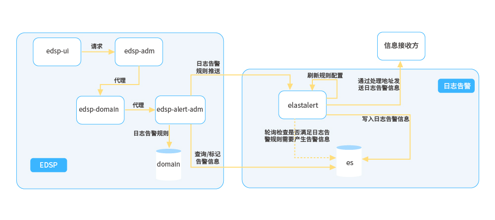 ●  日志告警:通過管控端配置告警規則提交到告警管理模塊落庫持久化,同時將告警規則推送至日志告警組件,然后刷新本地告警規則配置并定時輪詢檢測日志數據是否觸發告警規則,隨后產生相關告警事件,并將告警事件持久化,同時推送至告警推送系統進行下一步推送操作。