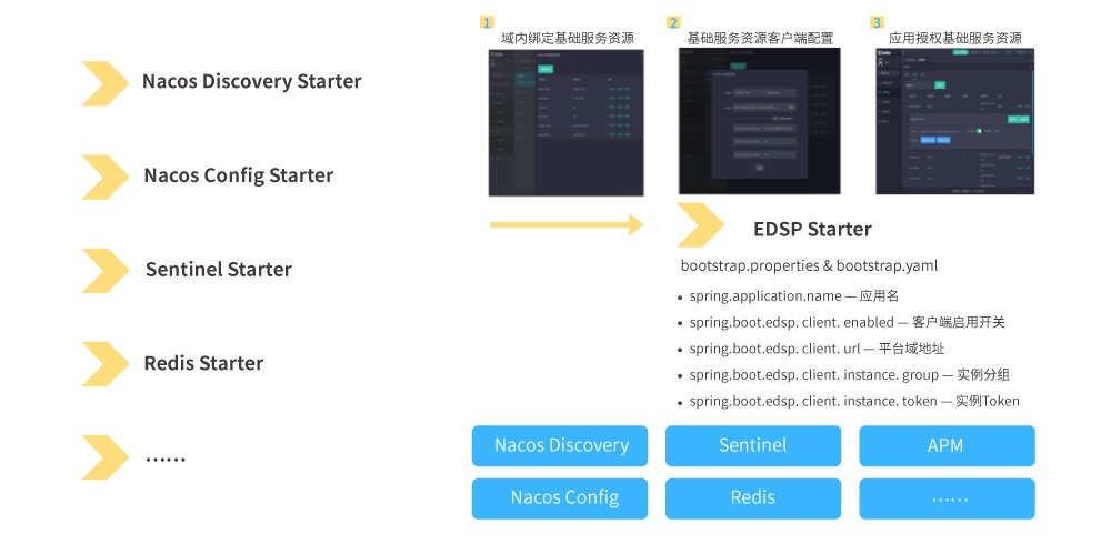 ■  將業務應用集成這些基礎組件所需要的各種客戶端Starter包裝成一個簡單且統一的客戶端Starter,利用Spring Boot內置的監聽器機制,在業務應用啟動時可以連接到平臺上以此來獲取連接這些組件資源所需要的各種參數,在這個過程中也可以通過Token機制實現對組件資源的訪問權限控制,即降低了業務應用集成這些基礎組件的配置參數管理難度,也提高了對基礎組件使用的安全管控能力。