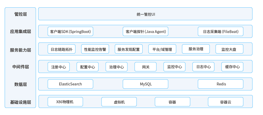 ● 中間件層:平臺所依賴的中間件,以開源為主,二次開發和私有實現為輔,包括注冊中心、配置中心、治理中心、網關中心、監控中心、日志中心、告警中心等;